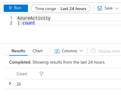 The above short query counts the number of rows in the AzureActivity with a timestamp less than or equal to 24 hours (as defined by the time range selector at the top of the query box). The extent and expanse of KQL is immense. If you’re interested, I highly recommend reviewing the KQL documentation in depth and practicing each of the skills listed in it.