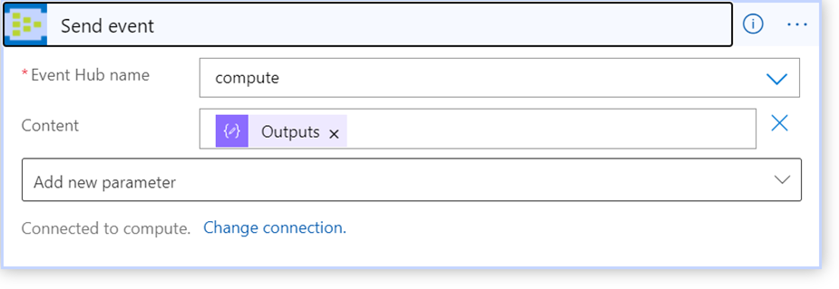 The last step was to send the completed message to Event Hub which required the Send event action in the Event Hubs category of connectors.