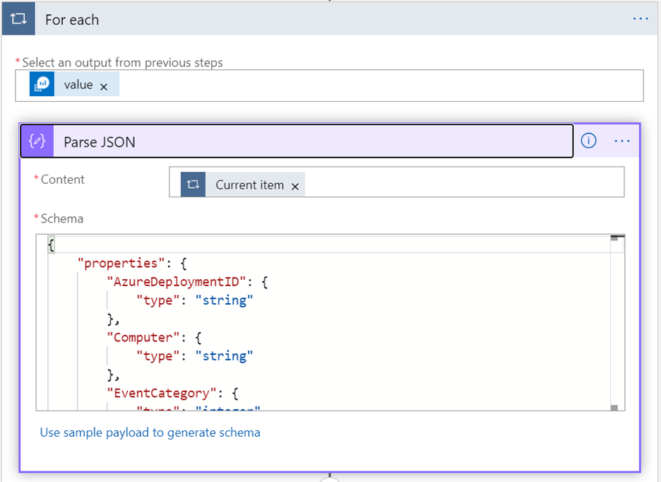 At the publication time of this post, these two schemas were valid. I was able to create two separate logic apps with these two schemas, and appropriate adjustments to the log query (to respect the table of data that the schema was applicable to).