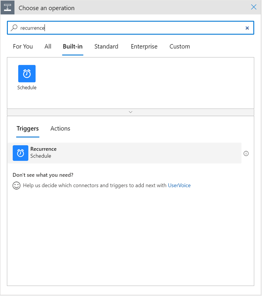 Logic Apps “is a cloud-based platform for creating and running automated workflows that integrate[s] apps, data, services, and systems.” Effectively, a low-code automation solution to perform exactly what my customer needs. I scanned the built-in connectors and found one called Schedule that had a trigger called Recurrence.