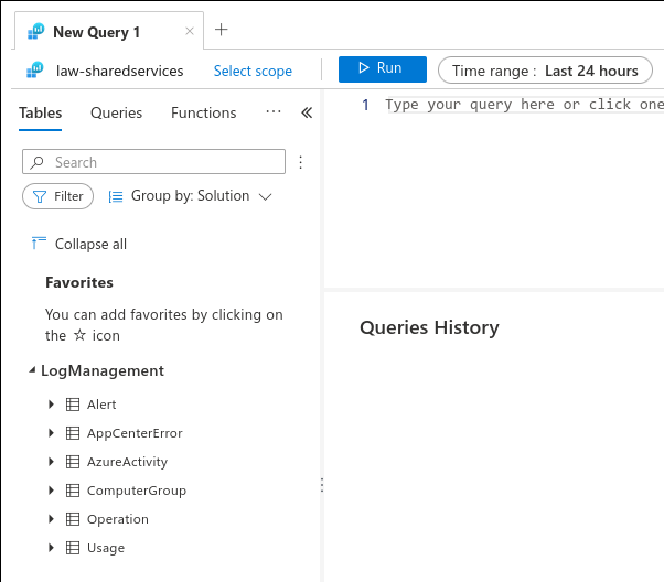 At a high level, LAW “is an Azure resource and a container where [log] data is collected, aggregated, and serves as an administrative boundary.”2 for analysis of the data. Log retention is typically the first checkbox that’s marked as part of an audit requirement whether an organization has workloads on-premise or in the public cloud. The challenge is how to make the logs you have actionable. One of the immediate benefits of directing logs to LAW is that it’s query engine is built on top of Azure Data Explorer which is powered by the Kusto Query Language (KQL). In comparison to other query languages (e.g., SQL, GraphQL), Kusto uses a similar syntax pattern that has a low barrier to entry. For example, once you create a workspace and start sending log data to it (after a brief delay for log ingestion), you’ll have a list of tables in the left pane of your workspace as shown below.