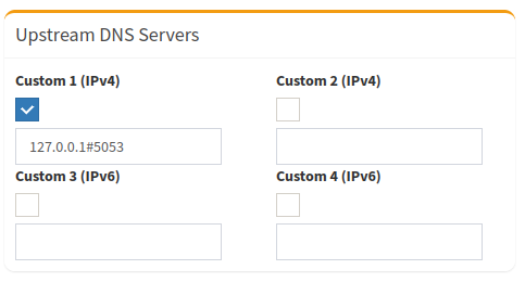 If I chose the easy route to implement DoT, I would be able to configure resolved (part of systemd)9 to forward queries over DoT through the addition of a single key value pair configuration setting DNSOverTLS. As long as the upstream resolver supports DoT, then this value can be set to true (it takes a Boolean, or the value opportunistic). With resolved configured properly, and running on the RPi, the final step is to configure the upstream DNS server to point to the local resolved listener. In the screenshot below, I configured pihole to use the DoH proxy which is listening on port 5053.
