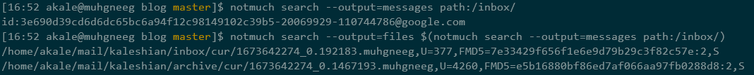 Note that the same piece of correspondence has two records; one in inbox, and one in archive. If I run a diff on both files, the output is the following:
